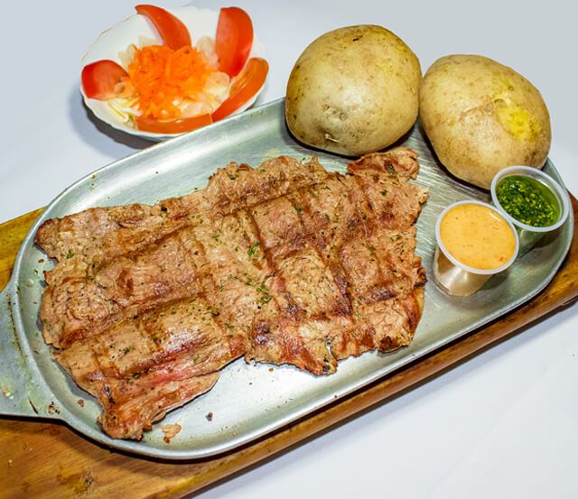 Corte americano de lomo biche, asado a la parrilla, acompañado    de papa cocida, maduro frito y ensalada. (Arroz Opcional)
