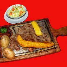 (Para dos Personas) Res, cerdo, pollo, chorizo, morcilla, hígado, costilla ahumada y chunchullo, acompañada de papa cocida y ensalada.